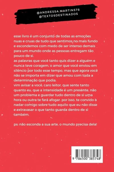 Esse livro um conjunto de todas as emo es nuas e cruas de tudo que sentimos no mais fundo e escondemos com medo de ser intenso demais para um mundo
