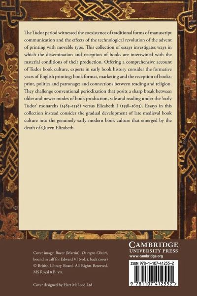 The consumption of books is closely intertwined with the material conditions of their production. The Tudor period saw both revolutionary progress in printing technology and the survival of traditional forms of communication from the manuscript era. Offering a comprehensive account of Tudor book culture, these essays by experts in early book history consider the formative years of English printing; book format, marketing, and the reception of books; print, politics, and patronage; and connections between reading and religion. They challenge the conventional view of the 1557 foundation of the Stationers' Company as an event that marks a shift between older and newer modes of book production, sale, and reading. Both continuity and change led to the gradual development of late medieval book culture into the genuinely early modern book culture that emerged by the death of Queen Elizabeth.