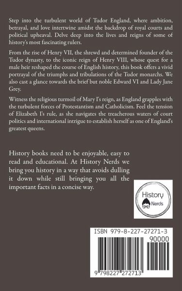 Step into the turbulent world of Tudor England, where ambition, betrayal, and love intertwine amidst the backdrop of royal courts and political upheaval. Delve deep into the lives and reigns of some of history's most fascinating rulers. From the rise of Henry VII, the shrewd and determined founder of the Tudor dynasty, to the iconic reign of Henry VIII, whose quest for a male heir reshaped the course of English history, this book offers a vivid portrayal of the triumphs and tribulations of the Tudor monarchs. We also cast a glance towards the brief but noble Edward VI and Lady Jane Grey. Witness the religious turmoil of Mary I's reign, as England grapples with the turbulent forces of Protestantism and Catholicism. Feel the tension of Elizabeth I's rule, as she navigates the treacherous waters of court politics and international intrigue to establish herself as one of England's greatest queens. Through meticulous research and engaging storytelling,we bring to life the personalities and dramas of each monarch, from the cunning machinations of Henry VII to the legendary wit of Elizabeth I.