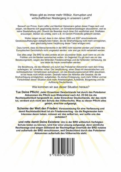 Das Buch "Tue Deine Pflicht" beschreibt die Ursachen für Justizwillkür, Korruption und wirtschaftlichen Niedergang in Form von einer fehlenden Staatshaftung. Es zeigt auf, wie Beamte sich deshalb gegenseitig decken, um Schadensersatzklagen abzuwehren. Obwohl die Beamten durch ihren Eid verpflichtet sind, Straftaten anzuzeigen, bleiben sie untätig, wenn z.B. im Gericht Protokolle gefälscht werden.In den Jahren 2006 und 2007 fanden unbemerkt von der Öffentlichkeit einschneidende Gesetzesaufhebungen statt, die die Strafverfolgung nicht mehr ermöglichen, aber gleichzeitig keine Verjährung dieser Taten erfolgen wird. Seit dem sind sämtliche Gesetze der Gerichtsbarkeit aufgehoben, außer Schiedsgerichte bei Arbeitsstreitigkeiten.Dazu kommt, dass die Menschenrechte in der BRD nicht beachtet werden und Urteile des Europäischen Gerichtshofs nicht umgesetzt werden bzw. gezielt Verhandlungen vor dem EGMR blockiert werden.Das alles zeigt: Die BRD ist alles andere als ein souveräner Staat, auch wenn es uns die Politiker und die Medien weismachen wollen. Im Gegenteil: Es gilt nach wie vor das Besatzungsrecht, wegen des fehlenden Friedensvertrags und der fehlenden Verfassung, die uns beide bis heute vorenthalten werden.Die Bewährung, die die Alliierten uns durch das Potsdamer Abkommen nach dem Krieg auferlegten, ist scheinbar vorbei. Die Verpflichtung, einen Staat mit demokratischen und rechtsstaatlichen Verhältnissen aufzubauen, um das Besatzungskonstrukt BRD abzulösen, ist bis heute nicht erfüllt worden. Deshalb haben die Alliierten alle Gesetze, die die Strafverfolgung ermöglichten, aufgehoben. Es drohen Enteignung, noch mehr Willkür und bei Fortschreiten dieser Situation könnten durchaus noch mehr Arbeitslosigkeit, Aufstände, Bürgerkrieg und sogar die Auflösung Deutschlands drohen.Wie kommen wir aus dieser Situation heraus?Tue Deine Pflicht: Jeder Einwohner Deutschlands hat durch das Potsdamer Abkommen die Pflicht zum Widerstand nach Art. 25 GG bis die Rechtstaatlichkeit hergestellt ist. Jeder Einwohner Deutschlands, der das nicht tut, verdient sich nicht den Schutz des Völkerrechts. Was zu dieser Pflicht alles gehört, wird hier aufgezeigt.Schenke der Welt den Frieden: Voraussetzung für eine Verfassung und damit Rechtstaatlichkeit ist ein Friedensvertrag - da die Regierenden kein Interesse daran haben, müssen wir das selbst tun, wer sollte uns das verbieten?und rette damit Deine Existenz: Um in der BRD willkürlich Verfolgten Schutz bieten zu können, wird hier eine Lösung aufgezeigt, denn sämtliche Rechtswege sind wegen Stillstand der Rechtspflege innerhalb der BRD nutzlos und außerhalb der BRD verschlossen, weil Deutschland durch das Potsdamer Abkommen außerhalb des Völkerrechts steht.