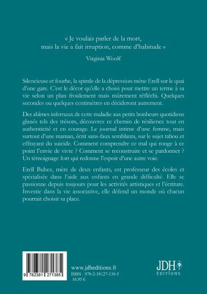 « Je voulais parler de la mort, mais la vie a fait irruption, comme d¿habitude » Virginia Woolf Silencieuse et fourbe, la spirale de la dépression mène Erell sur le quai d¿une gare. C¿est le décor qüelle a choisi pour mettre un terme à sa vie selon un plan froidement mais mûrement réfléchi. Quelques secondes ou quelques centimètres en décideront autrement. Des abîmes infernaux de cette maladie aux petits bonheurs quotidiens glanés tels des trésors, découvrez ce chemin de résilience tout en authenticité et en courage. Le journal intime d¿une femme, mais surtout d¿une maman, écrit sans faux-semblants, sur le sujet tabou et effrayant du suicide. Comment comprendre ce mal qui ronge à ce point l¿envie de vivre ? Comment se reconstruire et se pardonner ? Un témoignage fort qui redonne l¿espoir d¿une autre voie.