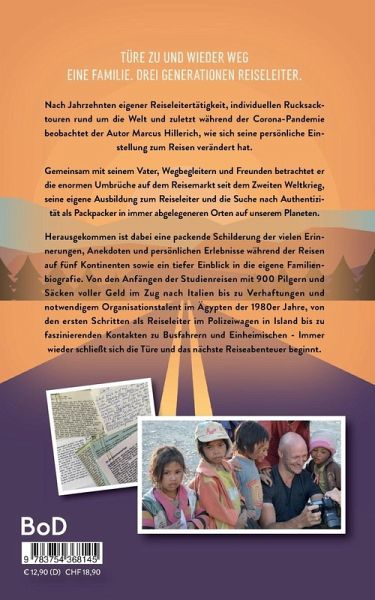 "Türe zu und wieder weg - Eine Familie. Drei Generationen Reiseleiter."Nach Jahrzehnten eigener Reiseleitertätigkeit, individuellen Rucksacktouren rund um die Welt und zuletzt während der Corona-Pandemie beobachtet der Autor Marcus Hillerich, wie sich seine persönliche Einstellung zum Reisen verändert hat.Gemeinsam mit seinem Vater, Wegbegleitern und Freunden betrachtet er die enormen Umbrüche auf dem Reisemarkt seit dem Zweiten Weltkrieg, seine eigene Ausbildung zum Reiseleiter und die Suche nach Authentizität als Packpacker in immer abgelegeneren Orten auf unserem Planeten.Herausgekommen ist dabei eine packende Schilderung der vielen Erinnerungen, Anekdoten und persönlichen Erlebnisse während der Reisen auf fünf Kontinenten sowie ein tiefer Einblick in die eigene Familienbiografie. Von den Anfängen der Studienreisen mit 900 Pilgern und Säcken voller Geld im Zug nach Italien bis zu Verhaftungen und notwendigem Organisationstalent im Ägypten der 1980er Jahre, von den ersten Schritten als Reiseleiter im Polizeiwagen in Island bis zu faszinierenden Kontakten zu Busfahrern und Einheimischen - Immer wieder schließt sich die Türe und das nächste Reiseabenteuer beginnt.