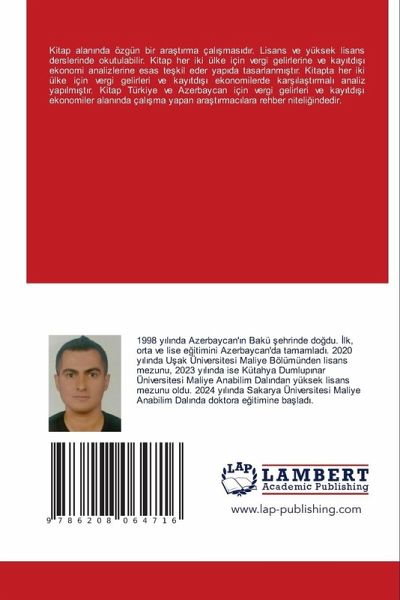 Kitap alan¿nda özgün bir arät¿rma çal¿¿mas¿d¿r. Lisans ve yüksek lisans derslerinde okutulabilir. Kitap her iki ülke için vergi gelirlerine ve kay¿td¿¿¿ ekonomi analizlerine esas te¿kil eder yap¿da tasarlanm¿¿t¿r. Kitapta her iki ülke için vergi gelirleri ve kay¿td¿¿¿ ekonomilerde kar¿¿lät¿rmal¿ analiz yap¿lm¿¿t¿r. Kitap Türkiye ve Azerbaycan için vergi gelirleri ve kay¿td¿¿¿ ekonomiler alan¿nda çal¿¿ma yapan arät¿rmac¿lara rehber niteli¿indedir.