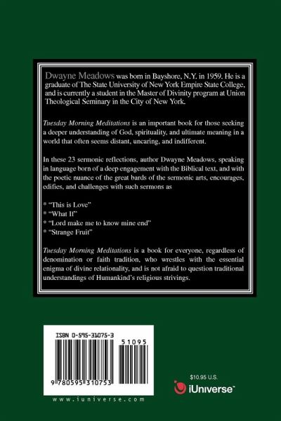 Tuesday Morning Meditations is an important book for those seeking a deeper understanding of God, spirituality, and ultimate meaning in a world that often seems distant, uncaring, and indifferent. In these 23 sermonic reflections, author Dwayne Meadows, speaking in language born of a deep engagement with the Biblical text, and with the poetic nuance of the great bards of the sermonic arts, encourages, edifies, and challenges with such sermons as * "This is Love" * "What If" * "Lord make me to know mine end" * "Strange Fruit" Tuesday Morning Meditations is a book for everyone, regardless of denomination or faith tradition, who wrestles with the essential enigma of divine relationality, and is not afraid to question traditional understandings of Humankind's religious strivings.