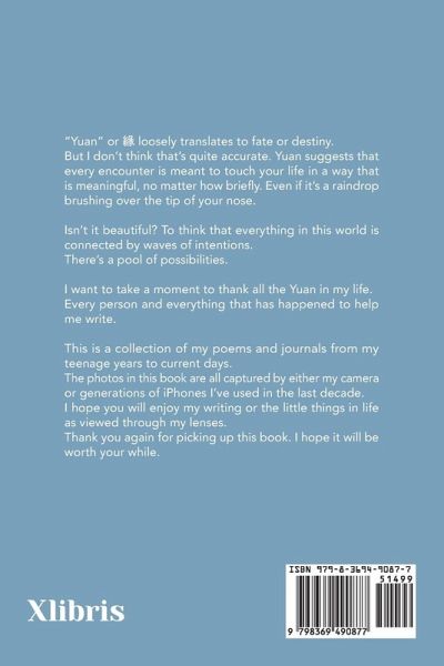 "Yuan" or loosely translates to fate or destiny. But I don't think that's quite accurate. Yuan suggests that every encounter is meant to touch your life in a way that is meaningful, no matter how briefly. Even if it's a raindrop brushing over the tip of your nose. Isn't it beautiful? To think that everything in this world is connected by waves of intentions. There's a pool of possibilities. I want to take a moment to thank all the Yuan in my life. Every person and everything that has happened to help me write. This is a collection of my poems and journals from my teenage years to current days. The photos in this book are all captured by either my camera or generations of iPhones I've used in the last decade. I hope you will enjoy my writing or the little things in life as viewed through my lenses. Thank you again for picking up this book. I hope it will be worth your while.