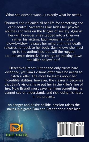 This is the 1st Psychic Visions Novel from USA Today Bestselling author Dale Mayer. The visions could destroy her. But they might help him catch a killer... Shunned and ridiculed all her life for something she can't control, Samantha Blair hides her psychic abilities. She lives on the fringes of society - until drawn out. Against her will, she taps into a killer's victims. Each woman's murder, blow-by-blow, ravages her mind until their death finally releases her. Sam goes to the authorities, but will the rugged, no-nonsense detective in charge of tracking down the killer want anything to do with her? Detective Brandt Sutherland only trusts hard evidence. Yet Sam's visions offer clues he needs. Desperately. He learns they come at a terrible price though. And the more he discovers about her abilities, the more worried he gets. Her visions threaten the killer. Danger and desire collide. And now Brandt must play a deadly game he dare not lose. If he does, Sam won't have a vision of the next murder. She'll be the victim...