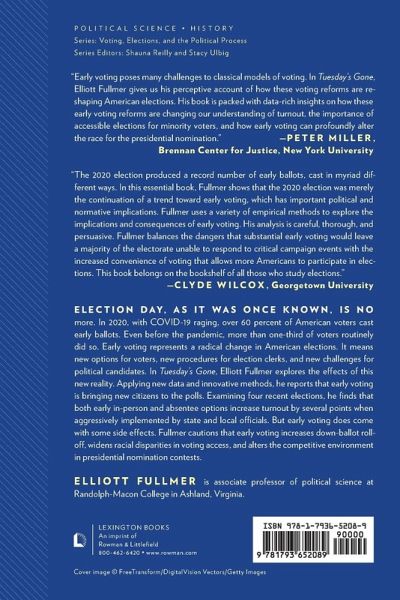 Early voting means new options for voters, a new set of procedures for election clerks, and new challenges for political candidates and operatives. In Tuesday's Gone, Elliott Fullmer explores the many effects of this radical change in U.S. elections, concluding that early voting - on balance - enhances the quality of American democracy.