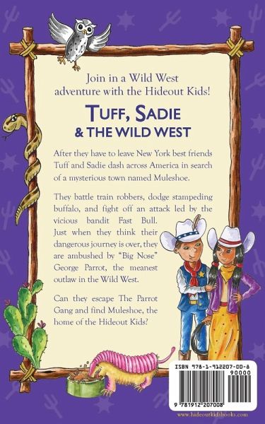 Join in a Wild West adventure with the Hideout Kids! After they have to leave New York best friends Tuff and Sadie dash across America in search of a mysterious town named Muleshoe. They battle train robbers, dodge stampeding buffalo, and fight off an attack led by the vicious bandit Fast Bull. Just when they think their dangerous journey is over, they are ambushed by "Big Nose" George Parrot, the meanest outlaw in the Wild West. Can they escape The Parrot Gang and find Muleshoe, the home of the Hideout Kids? Hideout Kids Series Description: The highly entertaining page-turner Hideout Kids is a brilliant children's Wild West action series. It features two ordinary ten-year old kids, the brave Sheriff Tuff Brunson and his clever best friend, Deputy Sadie Marcus. Joining their adventures is an amazing cast of fun-loving characters including Wild Thing, a pink fairy armadillo, and Mr Zip, a beaver. Each book tells incredible stories of cowboys, American Indians, outlaws, wagon trains, lost gold mines, cattle drives, and mountain men. How can two ten-year old kids tame the Wild West? Only in the beautifully written and illustrated Hideout Kids series can you find the answer!
