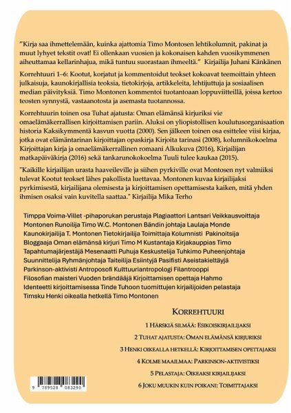 KORREHTUURI: KOOTUT, KORJATUT JA KOMMENTOIDUT TEOKSET 1 HÄRSKIÄ SILMÄÄ: ESIKOISKIRJAILIJAKSI 2 TUHAT AJATUSTA: OMAN ELÄMÄNSÄ KIRJURIKSI 3 HENKI OIKEALLA HETKELLÄ: KIRJOITTAMISEN OPETTAJAKSI 4 KOLME MAAILMAA: PARKINSON-AKTIVISTIKSI 5 PELASTAJA: OIKEAKSI KIRJAILIJAKSI 6 JOKU MUUKIN KUIN POIKANI: TOIMITTAJAKSI KESKIÖSSÄ OMAN TARINAN HAHMOTTAMINEN "Kirja saa ihmettelemään, kuinka ajattomia Timo Montosen lehtikolumnit, pakinat ja muut lyhyet tekstit ovat! Ei ollenkaan vuosien ja kokonaisen kahden vuosikymmenen aiheuttamaa kellarinhajua, mikä tuntuu suorastaan ihmeeltä." Kirjailija Juhani Känkänen Korrehtuuri 1-6: Kootut, korjatut ja kommentoidut teokset kokoavat teemoittain yhteen julkaisuja, kaunokirjallisia teoksia, tietokirjoja, artikkeleita, lehtijuttuja ja sosiaalisen median päivityksiä. Timo Montonen kommentoi tuotantoaan loppuviitteillä, joissa kertoo teosten synnystä, vastaanotosta ja asemasta tuotannossa. Korrehtuurin toinen osa Tuhat ajatusta: Oman elämänsä kirjuriksi vie omaelämäkerrallisen kirjoittamisen pariin. Aluksi on yliopistollisen koulutusorganisaation historia Kaksikymmentä kasvun vuotta (2000). Sen jälkeen toinen osa esittelee viisi kirjaa, jotka ovat elämäntarinan kirjoittajan opaskirja Kirjoita tarinasi (2008), kolumnikokoelma Kirjoittajan kirja ja omaelämäkerrallinen romaani Alkukuva (2016), Kirjailijan matkapäiväkirja (2016) sekä tankarunokokoelma Tuuli tulee kaukaa (2015). Timo Montonen kirjoittaa esipuheessa: "Keskiössä on oman tarinan hahmottaminen, oman totuuden kertominen, tuleminen kuulluksi ja nähdyksi, oli kyse sitten yksityisestä ihmisestä tai vaikkapa organisaatiosta ja tapahtuipa oman tarinan hahmottaminen ja jakaminen sitten suullisesti, kirjallisesti, kuvin tai vain mielen sisäisesti, mikä sekin on mahdollista kirjallisuudessa. Monin lähtökohdin, monin keinoin, monin tuloksin sovellan autobiografista, omaelämäkerrallista katsetta, ääntä ja ymmärrystä." "Kaikille kirjailijan urasta haaveileville ja siihen pyrkiville on Montosen nyt valmiiksi tulevat Kootut teokset lähes pakollista luettavaa. Montonen kuvaa kirjailijaksi pyrkimisestä, kirjailijana olemisesta ja kirjoittamisen opettamisesta kaiken, mitä yhden ihmisen osaksi vain kuvitella saattaa." Kirjailija Mika Terho