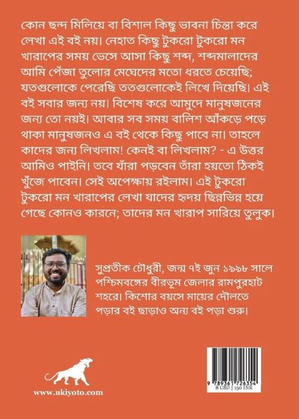 কোন ছন্দ মিলিয়ে বা বিশাল কিছু ভাবনা চিন্তা করে লেখা এই বই নয়। নেহাত কিছু টুকরো টুকরো মন খারাপের সময় ভেসে আসা কিছু শব্দ, শব্দমালাদের আমি পেঁজা তুলোর মেঘেদের মতো ধরতে চেয়েছি; যতগুলোকে পেরেছি ততগুলোকেই লিখে দিয়েছি। এই বই সবার জন্য নয়। বিশেষ করে আমুদে মানুষজনের জন্য তো নয়ই। আবার সব সময় বালিশ আঁকড়ে পড়ে থাকা মানুষজনও এ বই থেকে কিছু পাবে না। তাহলে কাদের জন্য লিখলাম! কেনই বা লিখলাম? এ উত্তর আমিও পাইনি। তবে যাঁরা পড়বেন তাঁরা হয়তো ঠিকই খুঁজে পাবেন। সেই অপেক্ষায় রইলাম। এই টুকরো টুকরো মন খারাপের লেখা যাদের হৃদয় ছিন্নভিন্ন হয়ে গেছে কোনও কারনে; তাদের মন খারাপ সারিয়ে তুলুক।