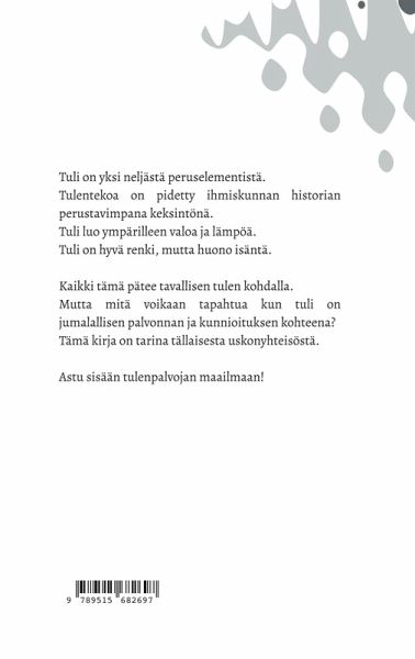 Tuli on yksi neljästä peruselementistä. Tulentekoa on pidetty ihmiskunnan historian perustavimpana keksintönä. Tuli luo ympärilleen valoa ja lämpöä. Tuli on hyvä renki, mutta huono isäntä. Kaikki tämä pätee tavallisen tulen kohdalla. Mutta mitä voikaan tapahtua kun tuli on jumalallisen palvonnan ja kunnioituksen kohteena? Tämä kirja on tarina tällaisesta uskonyhteisöstä. Astu sisään tulenpalvojan maailmaan!
