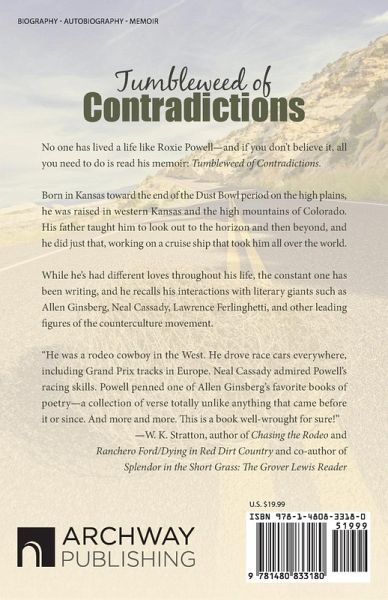 No one has lived a life like Roxie Powell--and if you don't believe it, all you need to do is read his memoir: Tumbleweed of Contradictions. Born in Kansas toward the end of the Dust Bowl period on the high plains, he was raised in western Kansas and the high mountains of Colorado. His father taught him to look out to the horizon and then beyond, and he did just that, working on a cruise ship that took him all over the world. While he's had different loves throughout his life, the constant one has been writing, and he recalls his interactions with literary giants such as Allen Ginsberg, Neal Cassady, Lawrence Ferlinghetti, and other leading figures of the counterculture movement. "He was a rodeo cowboy in the West. He drove race cars everywhere, including Grand Prix tracks in Europe. Neal Cassady admired Powell's racing skills. Powell penned one of Allen Ginsberg's favorite books of poetry--a collection of verse totally unlike anything that came before it or since. And more and more. This is a book well-wrought for sure!" --W. K. Stratton, author of Chasing the Rodeo and Ranchero Ford/Dying in Red Dirt Country and co-author of Splendor in the Short Grass: The Grover Lewis Reader