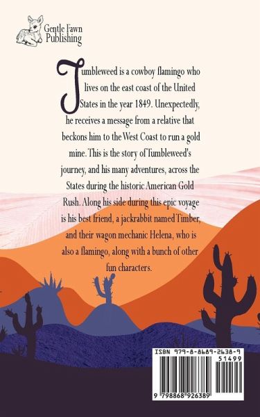 Tumbleweed is a cowboy flamingo who lives on the East Coast of the United States in the year 1849. Out of the blue, he receives a message from a relative urging him to head to the West Coast, where a gold mine awaits. Join Tumbleweed on his remarkable journey and the countless adventures he experienced as he traveled across the States during the historic American Gold Rush. Joining him on this incredible journey is his best friend, a jackrabbit named Timber, and their skilled wagon mechanic, Helena. This children's chapter book is an ideal choice for beginner / early readers or a delightful option for a family read-aloud. Join Tumbleweed on an enchanting adventure out West, where the themes of responsibility and friendship weave a captivating narrative that fuels the imagination, without violence or conflict. Tumbleweed the Cowboy Flamingo not only captivates readers with its engaging illustrations but also enriches the reading experience with a handy glossary of cowboy terms. Get your copy today and join Tumbleweed the cowboy flamingo on a thrilling adventure through the Wild West! Ages 4+