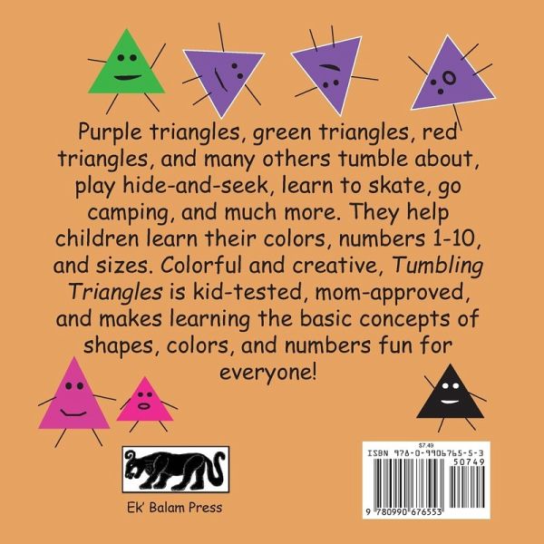 Tumbling Triangles teaches the basic concepts of numbers, colors, and shapes to young children through the use of bright and friendly triangle people. These purple, green, red, and other colorful triangles tumble about, play hide-and-seek, learn to skate, go camping, climb pyramids and mountains, and much more. Kid-tested and mom-approved, Tumbling Triangles makes learning basic concepts fun for everyone!
