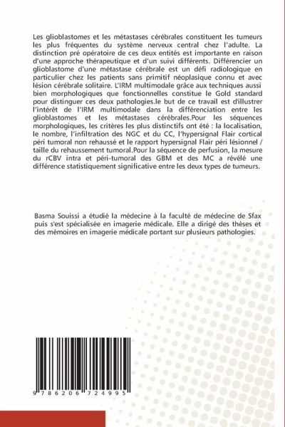 Les glioblastomes et les métastases cérébrales constituent les tumeurs les plus fréquentes du système nerveux central chez l'adulte. La distinction pré opératoire de ces deux entités est importante en raison d'une approche thérapeutique et d'un suivi différents. Différencier un glioblastome d'une métastase cérébrale est un défi radiologique en particulier chez les patients sans primitif néoplasique connu et avec lésion cérébrale solitaire. L'IRM multimodale grâce aux techniques aussi bien morphologiques que fonctionnelles constitue le Gold standard pour distinguer ces deux pathologies.le but de ce travail est d'illustrer l'intérêt de l'IRM multimodale dans la différenciation entre les glioblastomes et les métastases cérébrales.Pour les séquences morphologiques, les critères les plus distinctifs ont été : la localisation, le nombre, l'infiltration des NGC et du CC, l'hypersignal Flair cortical péri tumoral non rehaussé et le rapport hypersignal Flair péri lésionnel / taille du rehaussement tumoral.Pour la séquence de perfusion, la mesure du rCBV intra et péri-tumoral des GBM et des MC a révélé une différence statistiquement significative entre les deux types de tumeurs.