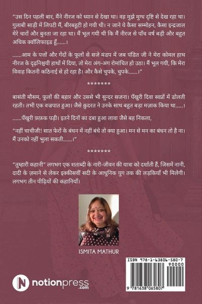 For the first time, on that day, I watched Neeraj intently. The gaze of his enchanted eyes was fixed on my face. Draped in a pink saree, I blushed red, with an unknown hypnotic attraction. A strange sensation carried me away. I forgot that I was five years older and much more qualified than him... In the pavilion, adorned with mango leaves and marigold flowers, all the difficult circumstances and the surreptitious way the marriage was getting solemnized were obliterated and I shivered with an intoxicating warmth as the panditji placed my soft hand in the grip of Neeraj's firm hand. Only thrill and excitement were there in the air, in every cell of my body... ******* Pankhuri was daydreaming all the time with the image of her tall and handsome fiancé floating in her eyes. The season of spring, the affluence of bright colorful flowers, all had become pale and faded before that silhouette. And suddenly, there came a bolt from the blue. Destiny had made a cruel joke... Pankhuri burst into tears, like the lava suppressed for so many days had found its way... No Chachiji! How does it matter, even if we have not been bound by way of seven circumambulations before the deity of fire? Our hearts are interwoven ever since the day of our engagement. I can never, ever forget him... ******* 'Tumhari Kahani' comprises stories of three generations, covering various aspects of female life in the Indian context. Spanning roughly over a century, the stories represent characters ranging from the traditional grandmother of the early twentieth century to the present-day homemaker, all the way to the financially independent modern woman of the twenty-first century with liberal thoughts.