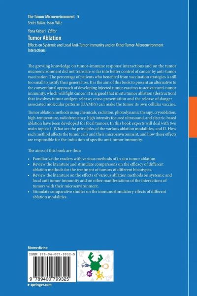 The aims of this book are thus: 1. Familiarize the readers with various methods of in situ tumor ablation. 2. Review the literature and stimulate comparisons on the efficacy of different ablation methods for the treatment of tumors of different histotypes. 3. Review the literature on the effects of various ablation methods on systemic and local anti tumor immunity and on other manifestations of the interactions of tumors with their microenvironment. 4. Stimulate comparative studies on the immunostimulatory effects of different ablation modalities.