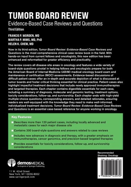 "The third edition of this textbook, now titled Tumor Board Review: Evidence-Based Case Reviews and Questions, includes recent advances in the diagnosis and treatment of the most common malignancies encountered by oncology providers. The text includes recently published clinical studies and updated cancer guidelines, as well as discussions of the importance of genetic mutations in selection of anticancer drugs based on phase III clinical trials in both solid tumors and hematological malignancies. The text uses a case-based format with each oncologic disease type presented in a tumor board format with a brief synopsis of a patient case followed by a discussion of the imaging and molecular and/or genomic sequencing required for a correct diagnosis. Each chapter concludes with a dialogue on staging and treatment including chemotherapy, immunotherapy, and targeted agent regimens, as well as pertinent information related to follow-up and survivorship. Board-style questions are included at the end of each chapter to help the reader enhance their knowledge base. The content of this third edition represents an effort to incorporate and highlight the most recent clinically relevant data in the field, and the book continues to represent a joint effort between oncology faculty and subspecialty fellows based at the Baylor College of Medicine (Houston, Texas), the University of Michigan Medical School (Ann Arbor, Michigan), and the University of California Davis Medical Center (Sacramento, California)"--