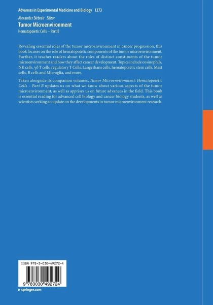 Eosinophils in the tumor microenvironment.- Dendritic cells in the tumor microenvironment.- Resident memory T cells in the tumor microenvironment.- NK cells in the tumor microenvironment.- Gammad T cells in tumor microenvironment.- Regulatory T Cells in the Tumor Microenvironment.- The Hematopoietic Microenvironment in Myeloproliferative Neoplasms: The Interplay Between Nature (Stem Cells) and Nurture (the Niche).- Langerhans cells in the tumor microenvironment.- Mast cells in the tumor microenvironment.- B cells in the gastrointestinal tumor microenvironment with a focus on pancreatic cancer: opportunities for precision medicine?.- Microglia in the Brain Tumor Microenvironment.- Index.