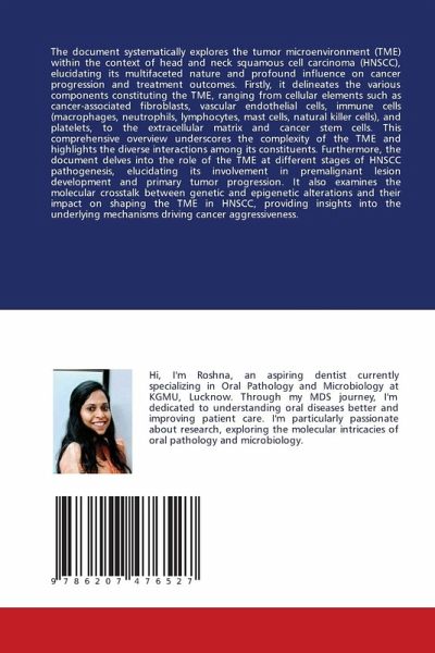 The document systematically explores the tumor microenvironment (TME) within the context of head and neck squamous cell carcinoma (HNSCC), elucidating its multifaceted nature and profound influence on cancer progression and treatment outcomes. Firstly, it delineates the various components constituting the TME, ranging from cellular elements such as cancer-associated fibroblasts, vascular endothelial cells, immune cells (macrophages, neutrophils, lymphocytes, mast cells, natural killer cells), and platelets, to the extracellular matrix and cancer stem cells. This comprehensive overview underscores the complexity of the TME and highlights the diverse interactions among its constituents. Furthermore, the document delves into the role of the TME at different stages of HNSCC pathogenesis, elucidating its involvement in premalignant lesion development and primary tumor progression. It also examines the molecular crosstalk between genetic and epigenetic alterations and their impact on shaping the TME in HNSCC, providing insights into the underlying mechanisms driving cancer aggressiveness.