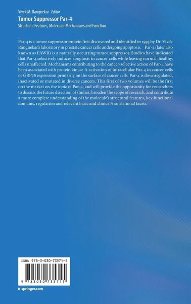 Par-4 is a tumor suppressor protein first discovered and identified in 1993 by Dr. Vivek Rangnekar's laboratory in prostate cancer cells undergoing apoptosis. Par-4 (later also known as PAWR) is a naturally occurring tumor suppressor. Studies have indicated that Par-4 selectively induces apoptosis in cancer cells while leaving normal, healthy, cells unaffected. Mechanisms contributing to the cancer-selective action of Par-4 have been associated with protein kinase A activation of intracellular Par-4 in cancer cells or GRP78 expression primarily on the surface of cancer cells. Par-4 is downregulated, inactivated or mutated in diverse cancers. This first of two volumes will be the first on the market on the topic of Par-4, and will provide the opportunity for researchers to discuss the future direction of studies, broaden the scope of research, and contribute a more complete understanding of the molecule's structural features, key functional domains, regulation and relevant basic and clinical/translational facets.
