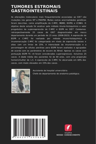As alterações moleculares mais frequentemente associadas ao GIST são mutações nos genes KIT e PDGFRA. Muitas outras anormalidades genéticas foram descritas, como amplificação de C-MYC, MDM2, EGFR1 e CCND1. O objetivo deste estudo foi analisar pelo método imuno-histoquímico o valor prognóstico da superexpressão de C-MYC e EGFR no GIST. Coletamos retrospectivamente 25 casos de GIST diagnosticados em nosso departamento durante um período de 15 anos (2008-2023). A expressão de EGFR e C-MYC foi realizada por método imuno-histoquímico. A imunomarcação C-MYC foi categorizada em níveis de expressão baixos e altos com um limiar de 25%. A intensidade da imunomarcação e a porcentagem de células positivas para EGFR foram avaliadas e agrupadas de acordo com os parâmetros do escore de Allred. Apenas os casos com pontuação EGFR TS >4 foram considerados superexpressos. Incluímos 25 casos. A idade média dos pacientes foi de 60 anos, com uma proporção homem/mulher de 1,5. A expressão de C-MYC foi observada em 60% dos casos, com níveis elevados em 33% dos casos.