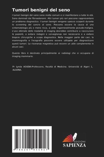 I tumori benigni del seno sono molto comuni e si manifestano a tutte le età. Sono dominati dai fibroadenomi. Altri tumori più rari possono rappresentare un problema diagnostico. I tumori benigni vengono spesso scoperti durante lo screening del cancro al seno. Possono essere la causa di una sintomatologia più o meno ricca, a volte ingannevolmente pseudo-maligna. L'uso ottimale delle modalità di imaging dovrebbe contribuire a rassicurare le pazienti, a evitare indagini e sorveglianza non necessarie e a evitare biopsie chirurgiche a scopo diagnostico. Nella maggior parte dei casi, la mammografia e l'ecografia possono essere utilizzate per diagnosticare questi tumori. La risonanza magnetica può essere un utile complemento in alcuni casi.Questo libro è destinato principalmente ai radiologi che si occupano di imaging mammario.