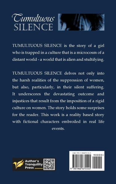 TUMULTUOUS SILENCE is the story of a girl who is trapped in a culture that is a microcosm of a distant world - a world that is alien and stultifying. TUMULTUOUS SILENCE delves not only into the harsh realities of the suppression of women but also, particularly, into their silent suffering. It underscores the devastating outcome and injustices that result from the imposition of a rigid culture on women. The story holds some surprises for the reader. This work is a reality-based story with fictional characters embroiled in real-life events.