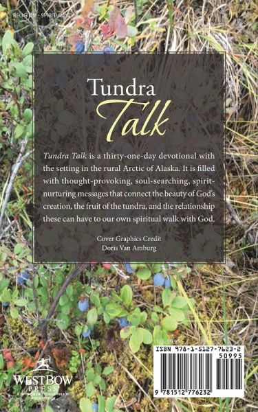Tundra Talk is a thirty-one-day devotional with the setting in the rural Arctic of Alaska. It is filled with thought-provoking, soul-searching, spirit-nurturing messages that connect the beauty of God’s creation, the fruit of the tundra, and the relationship these can have to our own spiritual walk with God.