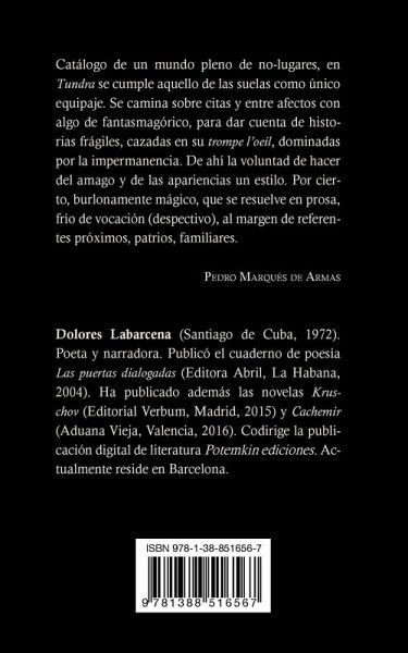 Catálogo de un mundo pleno de no-lugares, en Tundra se cumple aquello de las suelas como único equipaje. Se camina sobre citas y entre afectos con algo de fantasmagórico, para dar cuenta de historias frágiles, cazadas en su trompe l'oeil, dominadas por la impermanencia. De ahí la voluntad de hacer del amago y de las apariencias un estilo. Por cierto, burlonamente mágico, que se resuelve en prosa, frío de vocación (despectivo), al margen de referentes próximos, patrios, familiares. (Pedro Marqués de Armas)