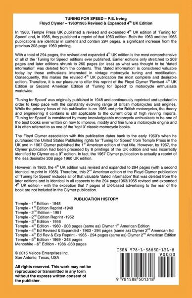 294 pages, 130 black & white illustrations, size 5.5 x 8.5 inches. In 1963, Temple Press UK published a revised and expanded 4th UK edition of 'Tuning for Speed' and, in 1965, they published a reprint of that 1963 edition. Both the 1963 and the 1965 publications are identical in content and contain 294 pages, a significant increase from the previous 208 page 1960 printing. With a total of 294 pages, the revised and expanded 4th UK edition is the most comprehensive of all of the 'Tuning for Speed' editions ever published. Earlier editions only stretched to 208 pages and later editions shrunk to 260 pages (or less) as what was thought to be 'dated information' was deleted from the contents. This 'dated information' is considered valuable today by those enthusiasts interested in vintage motorcycle tuning and modification. Consequently, this makes the revised 4th UK publication the most complete and desirable edition. Therefore, it is our pleasure to offer this reprint of the Floyd Clymer 'Revised 4th UK Edition or Second American Edition of 'Tuning for Speed' to motorcycle enthusiasts worldwide. 'Tuning for Speed' was originally published in 1948 and continuously reprinted and updated in order to keep pace with the constantly evolving range of British motorcycles and engines. While the primary focus of this publication is on 1965 and prior British motorcycles, the theory and engineering it contains is still applicable to the current crop of high revving imports. 'Tuning for Speed' is considered by many knowledgeable motorcycle enthusiasts to be one of the best books ever written on how to improve, modify and fine tune a motorcycle engine and it is often referred to as one of the 'top 10' classic motorcycle books. The Floyd Clymer association with this publication dates back to the early 1960's when he purchased the United States Publishing rights for 'Tuning for Speed' from Temple Press in the UK and, in 1967, Clymer published the 1st American edition of that title. However, by 1967, the Clymer publication had been preceded by 8 printings of the UK edition and was incorrectly identified by Clymer as a 9th edition. In fact, the 1967 Clymer publication is actually a reprint of the less desirable 208 page 1960 UK edition. However, in 1963, the 4th UK edition was revised and expanded to 294 pages (with a second identical re-print in 1965). Therefore, this 2nd American edition of the Floyd Clymer publication of 'Tuning for Speed' includes all of that valuable 'dated information' that was deleted from the later editions and is identical in all respects to the 294 page1963/1965 revised and expanded 4th UK edition - with the exception that 7 pages of UK-based advertising to the rear of the book are not included in the Clymer publication.