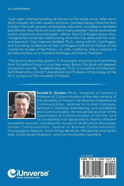 Last night I finished reading all the rest of this lovely book. After each short chapter, rich with wisdom and love, I just kept being moved by Ron Gordons life path as poet, philosopher, educator, and person-centered practitioner. May this book soon be in many peoples hands and homes and in classrooms and therapists offices. Had Carl Rogers known Ron, I imagine he would rest well knowing what Ron has done with his work, and beyond. Gay Swenson Barfield, Ph.D., along with Dr. Carl Rogers, was founding co-director of the Carl Rogers Institute for Peace at the Center for Studies of the Person, La Jolla, California. She is currently in private practice as a Licensed Marriage and Family Therapist. This book is absolutely great! Im thoroughly enjoying and benefiting from this brilliant book in countless ways. Bravo! This book will deepen and enrich your life. Noelie Rodriguez, Ph.D., is co-author of Systematic Self-Observation [SAGE Publications] and Professor of Sociology at the HCC campus of the University of Hawaii.