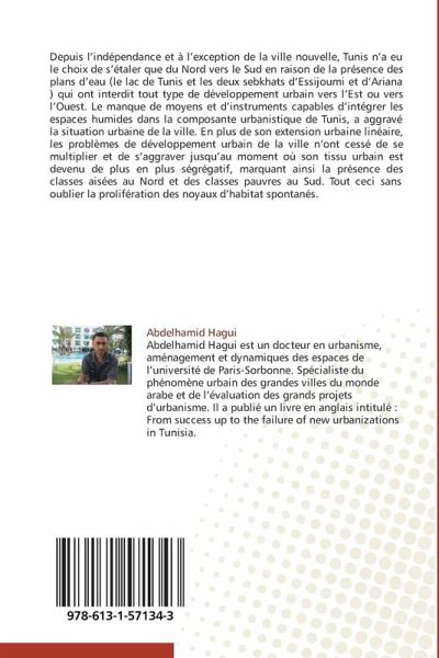 Depuis l'indépendance et à l'exception de la ville nouvelle, Tunis n'a eu le choix de s'étaler que du Nord vers le Sud en raison de la présence des plans d'eau (le lac de Tunis et les deux sebkhats d'Essijoumi et d'Ariana ) qui ont interdit tout type de développement urbain vers l'Est ou vers l'Ouest. Le manque de moyens et d'instruments capables d'intégrer les espaces humides dans la composante urbanistique de Tunis, a aggravé la situation urbaine de la ville. En plus de son extension urbaine linéaire, les problèmes de développement urbain de la ville n'ont cessé de se multiplier et de s'aggraver jusqu'au moment où son tissu urbain est devenu de plus en plus ségrégatif, marquant ainsi la présence des classes aisées au Nord et des classes pauvres au Sud. Tout ceci sans oublier la prolifération des noyaux d'habitat spontanés.