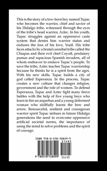 This is a story about a low-born boy named Tupac who becomes the warrior chief savior of his Hidalgo tribe told through the eyes of Aztec the tribes head warrior. In his youth Tupac struggled against an oppressive caste system that denied him warrior status and endured the loss of his love Yoatl. His tribe faced fearsome mountain lions called pumas, a brutal cannibal tribe called the Chiapas and their evil chief Coyotl and rapacious Spanish invaders, all of whom endeavored to enslave his tribe. To save it Aztec teaches Tupac warriorship because he thinks he is a spirit from the ages and with his new skills Tupac builds a new city of god called Esperanza. In the process Tupac creates a new culture that changed religion, government and the role of women. To defend Esperanza Tupac and Aztec fight many fierce battles with the help of five young boys (who learned to fire an arquebus) and a young deformed woman (who skillfully learned the bow and arrow). Resourceful, resilient and courageous warrior spirit Tupac imbued in future Hidalgo generations the need to overcome oppressive artificial societal norms, to use the mind to solve problems and the spirit of courage.