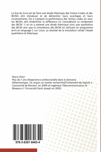 Le but du livre est de faire une étude théorique des Turbos Codes et des BICMs afin d'analyser et de démontrer leurs avantages et leurs inconvénients. On a comparé la performance des Turbos codes en avec les BICMs afin d'identifier la différence. En Considérant Le rendement des BICM et on a entamé une étude théorique ainsi que qualitative des BICM ansi que la simulations des BICM en utilisant un programme écrit en language C sur Linux. Le résultat de la simulation valide l étude qualitative et théorique.