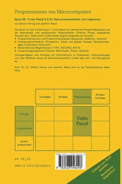 1 Einführung.- 1.1 Turbo Pascal als Programmiersprache.- 1.2 Datenstrukturen.- 1.3 Programmstrukturen.- 1.4 Systematische Programmentwicklung.- 1.5 Arbeiten mit Turbo Pascal.- 1.6 Programmieren in Turbo Pascal.- 2 Programmstrukturen und Programmierbeispiele.- 2.1 Folgestrukturen (Sequenzen).- 2.2 Auswahlstrukturen (Selektion).- 2.3 Wiederholung (Iteration).- 3 Unterprogrammtechnik.- 3.1 Unterprogramme (Prozeduren).- 3.2 Lokale und globale Variable (Konstante).- 3.3 Prozeduren mit Parameterübergabe.- 3.4 Funktionen.- 3.5 Rekursive Abläufe (Rekursionen).- 4 Weiterführende Möglichkeiten zum Umgang mit Datentypen und Datenstrukturen.- 4.1 Definition von Datentypen durch den Benutzer (TYPE-An Weisung).- 4.2 Strukturierung von Daten als RECORD.- 4.3 Vereinfachte Bearbeitung von RECORDs (WITH-Anweisung).- 4.4 Strukturierung von Daten als FILE (Datei).- 5 Anwendungsprogramme.- 5.1 Chemie.- 5.2 Mathematik.- 5.3 Physik.- 5.4 Statistik.- AI Operatoren.- A 1.1 Vergleichsoperatoren.- A 1.2 Arithmetische Operationen.- A 1.3 Logische Operatoren.- A 1.4 Adreß-Operatoren.- A 1.5 Mathematische Funktionen.- A2 Alphabetische Reihenfolge der Befehle.- A3 Fehlermeldungen.- A 3.1 Compiler-Fehlermeldungen.- A 3.2 Laufzeit-Fehlermeldungen.- A4 Arbeiten mit dem Debugger und der Break/watch-Funktion.- A 4.1 Aufgabe des Debuggers.- A 4.2 Verfolgen der Werte einzelner Variablen.- A 4.3 Gleichzeitiges Überwachen mehrerer Variablen.- A 4.4 Zusammenfassung.- A5 Lösungen der Übungsaufgaben.- A 5.1 WURF 1.PAS.- A 5.2 WURF2.PAS.- A 5.3 KUGEL.PAS.- A 5.4 SHELL.PAS.- A6 Unterschiede zwischen den Versionen.- A 6.1 Unterschiede in den Compiler-Befehlen und UNITs.- A 6.2 Unterschiede zwischen Version 3 und Version 4.- A 6.2.1 Allgemeine Unterschiede.- A 6.2.2 Spezielle Unterschiede.- A 6.3Unterschiede zwischen Version 4 und Version 5.- A 6.3.1 Allgemeine Unterschiede.- A 6.3.2 Spezielle Unterschiede.- A 6.4 Umwandlung von Programmen der verschiedenen Versionen.- A 6.4.1 Umwandeln von Programmen der Version 3 in Version 5.- A 6.4.2 Umwandeln von Programmen der Version 3 in Version 4.- Sachwortverzeichnis.