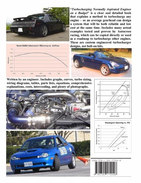 Turbocharging Normally Aspirated Engines on a Budget is a clear and detailed book that explains a method to turbocharge any engine - so the average gearhead can design a system that will be both reliable and low cost at the same time. This explains how to make custom turbocharger installations for any car, not bolt-on kits. Includes Toyota, GM, Dodge, and Mazda examples, tested and proven by Autocross racing experience, which can be copied directly or used as a roadmap to turbocharge other engines. Topics include eliminating spark knock, calculating horsepower, selecting turbocharger, CE (Compressor Efficiency), MAP, MAF, fuel injectors, upgrading the fuel system, intercoolers, and more. Written by an engineer. Includes detailed wiring diagrams, graphs, tables, formulas, and plenty of photographs. An Excel spreadsheet (for calculating turbocharger performance) described in the book can be downloaded from the author at LS6Fiero at Yahoo dot com.