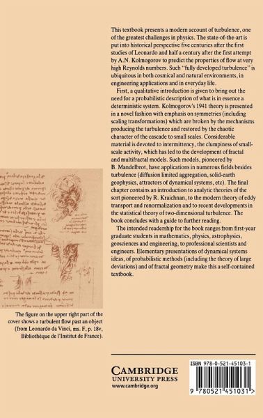 This textbook presents a modern account of turbulence, one of the greatest challenges in physics. The state-of-the-art is put into historical perspective five centuries after the first studies of Leonardo and half a century after the first attempt by A.N. Kolmogorov to predict the properties of flow at very high Reynolds numbers. Such "fully developed turbulence" is ubiquitous in both cosmical and natural environments, in engineering applications and in everyday life. First, a qualitative introduction is given to bring out the need for a probabilistic description of what is in essence a deterministic system. Kolmogorov's 1941 theory is presented in a novel fashion with emphasis on symmetries (including scaling transformations) which are broken by the mechanisms producing the turbulence and restored by the chaotic character of the cascade to small scales. Considerable material is devoted to intermittency, the clumpiness of small-scale activity, which has led to the development of fractal and multifractal models. Such models, pioneered by B. Mandelbrot, have applications in numerous fields besides turbulence (diffusion limited aggregation, solid-earth geophysics, attractors of dynamical systems, etc). The final chapter contains an introduction to analytic theories of the sort pioneered by R. Kraichnan, to the modern theory of eddy transport and renormalization and to recent developments in the statistical theory of two-dimensional turbulence. The book concludes with a guide to further reading. The intended readership for the book ranges from first-year graduate students in mathematics, physics, astrophysics, geosciences and engineering, to professional scientists and engineers.