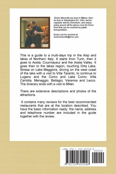 This is a guide to a multi-days trip in the Alsp and lakes of Northern Italy. It starts from Turin, then it goes to Aosta, Courmayeur and the Aosta Valley. It goes then to the lakes region, touching Orta Lake, Stresa on Lake Maggiore, driving on the west coast of the lake with a visit to Villa Taranto, to continue to Lugano and the Como and Lake Como: Villa Carlotta, Menaggio, Bellagio, Varenna and Lecco. The itinerary ends with a visit to Milan. There are extensive descriptions and photos of the attractions. It contains many reviews for the best recommended restaurants that are at the location described. You have the basic information ready: the name, address and telephone number are included in the guide together with the review.