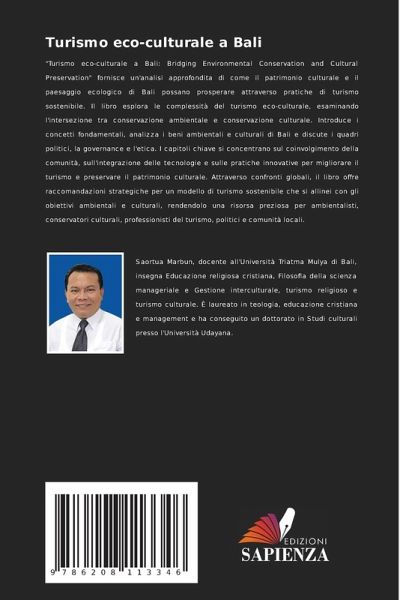 "Turismo eco-culturale a Bali: Bridging Environmental Conservation and Cultural Preservation" fornisce un'analisi approfondita di come il patrimonio culturale e il paesaggio ecologico di Bali possano prosperare attraverso pratiche di turismo sostenibile. Il libro esplora le complessità del turismo eco-culturale, esaminando l'intersezione tra conservazione ambientale e conservazione culturale. Introduce i concetti fondamentali, analizza i beni ambientali e culturali di Bali e discute i quadri politici, la governance e l'etica. I capitoli chiave si concentrano sul coinvolgimento della comunità, sull'integrazione delle tecnologie e sulle pratiche innovative per migliorare il turismo e preservare il patrimonio culturale. Attraverso confronti globali, il libro offre raccomandazioni strategiche per un modello di turismo sostenibile che si allinei con gli obiettivi ambientali e culturali, rendendolo una risorsa preziosa per ambientalisti, conservatori culturali, professionisti del turismo, politici e comunità locali.