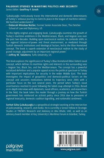 This book explores the significance of Turkey's Blue Homeland (Mavi Vatan) naval concept, which defines its maritime rights and interests in the surrounding seas - Aegean Sea, Black Sea, and the Mediterranean. The concept has a powerful socialized definition and a popular appeal across the political spectrum in Turkey with important implications for security in the wider Middle East. The book investigates the impact of geopolitics and domestic-political factors on the concept and uncovers motivations behind its trajectory since 2004 with a particular focus on the last several years, the period when Turkey's naval assertiveness reached its peak following the failed coup attempt in 2016. Based on in-depth interviews with diplomats, naval officers, academics, and researchers in the field, the book takes the reader through a journey on how the Turkish government has reinforced an activist policy since 2016 due to pressures of regional insecurity, domestic coalition logrolling, and nationalist sentiment.