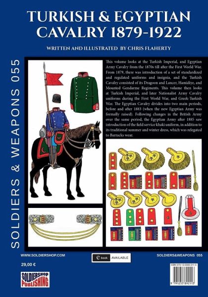 This volume looks at the Turkish Imperial, and Egyptian Army Cavalry from the 1870s till after the First World War. From 1879, there was introduction of a set of standardized and regulated uniforms and insignia, and the Turkish Cavalry consisted of its Dragoon and Lancer, Hamidiye, and Mounted Gendarme Regiments. This volume then looks at Turkish Imperial, and later Nationalist Army Cavalry uniforms during the First World War, and Greek-Turkish War. The Egyptian Cavalry divides into two main periods, before and after 1883 (when the new Egyptian Army was formally raised). Following changes in the British Army over the same period, the Egyptian Army after 1885 saw introduction of the field service khaki uniform, in addition to its traditional summer and winter dress, which was relegated to Barracks wear.