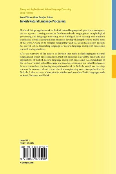 Turkish and its challenges for language and speech processing (Kemal Oflazer, Murat Saraçlar).- Morphological processing for Turkish (Kemal Oflazer).- Morphological disambiguation for Turkish (Dilek Zeynep Hakkani-Tür, Murat Saraçlar, Gökhan Tür, Kemal Oflazer, Deniz Yuret).- Language modeling for Turkish text and speech processing (Ebru Arisoy, Murat Saraçlar).- Turkish speech recognition (Ebru Arisoy, Murat Saraçlar).- Turkish named entity recognition (Reyyan Yeniterzi, Gökhan Tür, Kemal Oflazer).- Dependency parsing of Turkish (Gülsen Eryigit, Joakim Nivre, Kemal Oflazer).- Wide-covering parsing, semantics and morphology (Ruket Çakici, Mark Steedman, Cem Bozsahin).- Deep parsing of Turkish with lexical-functional grammar (Özlem Çetinoglu, Kemal Oflazer).- Statistical Machine Translation and Turkish (Kemal Oflazer, Reyyan Yeniterzi, lknur Durgar-El Kahlout).- Machine Translation between Turkic languages (A. Cüneyd Tantug, Esref Adali).- Sentiment analysis in Turkish (Gizem Gezici, Berrin Yanikoglu).- The Turkish treebank (Gülsen Eryigit, Kemal Oflazer, Umut Sulubacak).- Linguistic corpora: A view from Turkish (Mustafa Aksan, Yesim Aksan).- Turkish wordnet (Özlem Çetinoglu, Orhan Bilgin, Kemal Oflazer).- Turkish discourse bank: Connectives and their configurations (Deniz Zeyrek, Isin Demirsahin, Cem Bozsahin).-