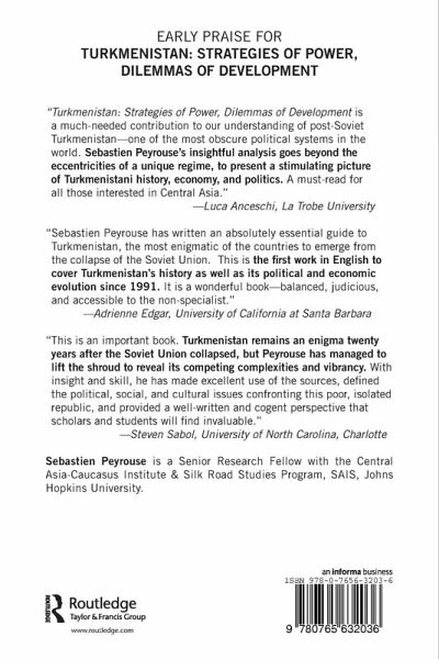 Part 1 Old Territory, Multiple Influences, New Nation Chapter 1 Turkmen Territory: Unity and Diversity Chapter 2 From Antiquity to the Khanates: A History of Fits and Starts Chapter 3 The Impact of Russian-Soviet Modernization Chapter 4 The Building of the Turkmen Nation Part 2 Post-Soviet Technologies of Power Chapter 5 An Independence Marked by Niyazov's Authoritarian Rule Chapter 6 Culture and Religion: The Issues of Reconstruction Chapter 7 Gurbanguly Berdymukhammedov: Illusion of a Khrushchevian Thaw? Part 3 Development Challenges and Strategies Chapter 8 Turkmenistan from the Inside: Social and Economic Evolutions Chapter 9 The Future "Kuwait of Central Asia"? Chapter 10 Finding Its Place on the International Stage concl Conclusions