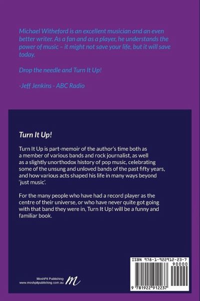 Turn it Up! is part-memoir of my time as a musician and journalist, and part-pop history, examining some of the unsung or more interesting bands which I have connected with in some way since I began listening to the radio as a kid. It begins with my first concert experience as a thirteen-year-old watching Ike and Tina Turner. I then revisit the records that impacted on me as a young teenager and the music that spurred me on to play myself when I was older. I weave in and out of my chequered progress in music, while pausing now and then to shine a light on the way rock music evolved in the eighties and nineties. The mood is studious and knowledgeable but also light and comedic as I revisit some of my more eventful interviews I conducted with acts such as Bjork, Nirvana and Pulp. Throughout the book I detail the way my own bands became successful, but not quite successful enough, and detail the various catastrophes which may have contributed to that. I introduce the reader to some of the more eccentric characters I have met through music, from Lenny the Launceston punk, who burned down his own shop accidentally, to Kevin Shields from the band My Bloody Valentine who took 55 minutes to answer one question I'd put to him. The book is not dissimilar to Giles Smith's Lost In Music, but that book is very much of the UK in the '80s, and doesn't examine the strange dynamic between the interviewer and the interviewee, which can veer between both parties wishing they were doing something else, to a more edgy encounter where the possibility of a 'scoop' gets the blood rushing. The book ends with some reflections on why music can be the most constant and loved companion in our lives. Turn It Up! is 55 000 words long.