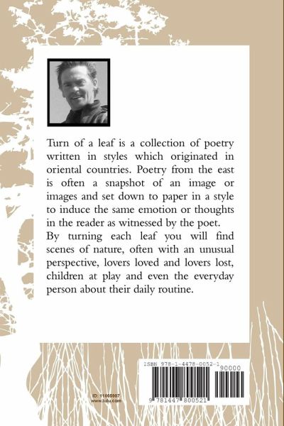 Turn of a leaf is a collection of poetry written in styles which originated in oriental countries. Poetry from the east is often a snapshot of an image or images and set down to paper in a style to induce the same emotion or thoughts in the reader as witnessed by the poet. By turning each leaf you will find scenes of nature, often with an unusual perspective, lovers loved and lovers lost, children at play and even the everyday person about their daily routine.