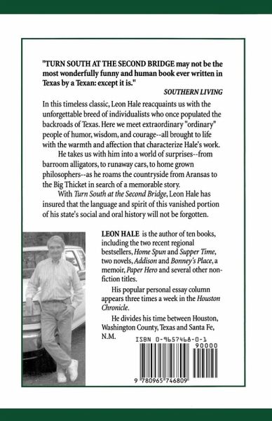 In this little gem of a book Leon Hale reacquaints us with the back road individualists who have given Texas much of its character over the past century. A novelist and columnist for fifty years, Hale has built his reputation on an exceptionally smooth writing style combined with a sharp eye for what's unusual and remarkable hidden among the otherwise ordinary people and places of Texas, for example, the alligator that slept by the stove at Scheller's Place; the ghost of Fiddler's Island; or the billboard newspaper of Tillie Roome. Turn South at the Second Bridge chronicles a world that abounds with surprises. Check out Virge Whitfield, who combined wisdom with a limitless love of dogs; or Pat Craddock, whose skill at cooking whiskey cost him a leg; or Jack Hillhouse, the one-armed giant beach-dweller who had an unusual way of obtaining fresh eggs. Hale takes us along with him, down winter beaches from Galveston to Port Aransas, deep into the Piney Woods of East Texas, through the bottom lands of the Trinity, the Brazos, and the Colorado Rivers, as he searches for the unique characters who inhabit the part of Texas you don't find in guide books. Many of the places and most of the people chronicled in this delightful Texas classic have vanished by now, and we are the poorer for it. Fortunately for us, however, Hale has captured with warm affection the language and spirit of this memorable part of his state's social and oral history, in the shape of stories and characters you won't forget.