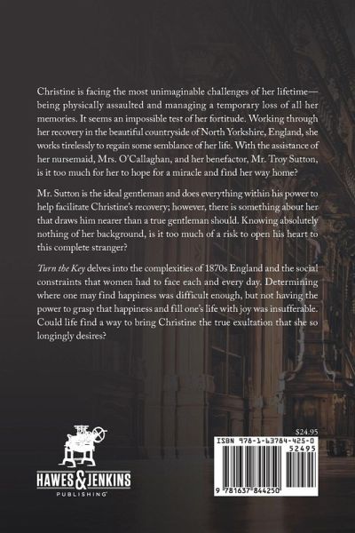 Christine is facing the most unimaginable challenges of her lifetime--being physically assaulted and managing a temporary loss of all her memories. It seems an impossible test of her fortitude. Working through her recovery in the beautiful countryside of North Yorkshire, England, she works tirelessly to regain some semblance of her life. With the assistance of her nursemaid, Mrs. O'Callaghan, and her benefactor, Mr. Troy Sutton, is it too much for her to hope for a miracle and find her way home?Mr. Sutton is the ideal gentleman and does everything within his power to help facilitate Christine's recovery; however, there is something about her that draws him nearer than a true gentleman should. Knowing absolutely nothing of her background, is it too much of a risk to open his heart to this complete stranger?Turn the Key delves into the complexities of 1870s England and the social constraints that women had to face each and every day. Determining where one may find happiness was difficult enough, but not having the power to grasp that happiness and fill one's life with joy was insufferable. Could life find a way to bring Christine the true exultation that she so longingly desires?