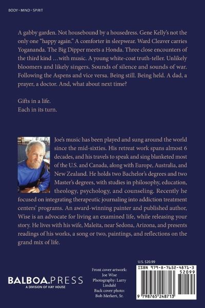 Joe's music has been played and sung around the world since the mid-sixties. His retreat work spans almost 6 decades, and his travels to speak and sing blanketed most of the U.S. and Canada, along with Europe, Australia, and New Zealand. He holds two Bachelor's degrees and two Master's degrees, with studies in philosophy, education, theology, psychology, and counseling. Recently he focused on integrating therapeutic journaling into addiction treatment centers' programs. An award-winning painter and published author, Wise is an advocate for living an examined life, while releasing your story. He lives with his wife, Maleita, near Sedona, Arizona, and presents readings of his works, a song or two, paintings, and reflections on the grand mix of life.