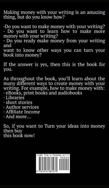 Making money with your writing is an amazing thing, but do you know how? · Do you want to make money with your writing? · Do you want to learn how to make more money with your writing? · Do you ready make money from your writing and want to know other ways you can turn your book into money? If the answer is yes, then this is the book for you. As throughout the book, you'll learn about the many different ways to create money with your writing. For example, how to make money with: · eBooks, print books and audiobooks · Libraries · short stories · Author services · Affiliate Income · And more... So, if you want to Turn your ideas into money then buy this book now! Contents: · Introduction and prerequisites to making money with your writing. · How to make money with ebooks, print books, audiobooks, bundles, boxsets, libraries and more. · How to make money with your writing in other ways with courses, merchandise, author services, sponsorship and more. · If these ideas are peaked you're interested then please consider downloading a sample or buying today to start learning how to make money with your writing!